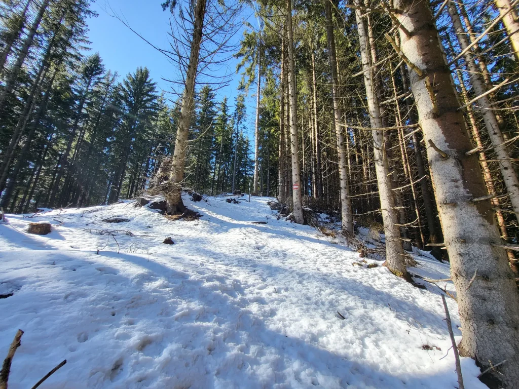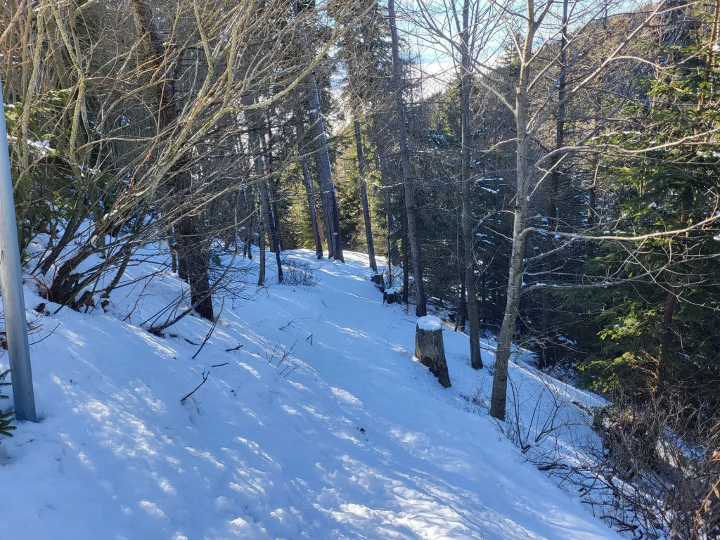 Bis zum Pinkenkogel sind es ab hier weniger als 2 Kilometer. Der Anstieg ist moderat, aber konstant, und führt durch dichten Wald. Besonders im Winter entsteht hier eine sehr ruhige, fast abgeschiedene Atmosphäre.